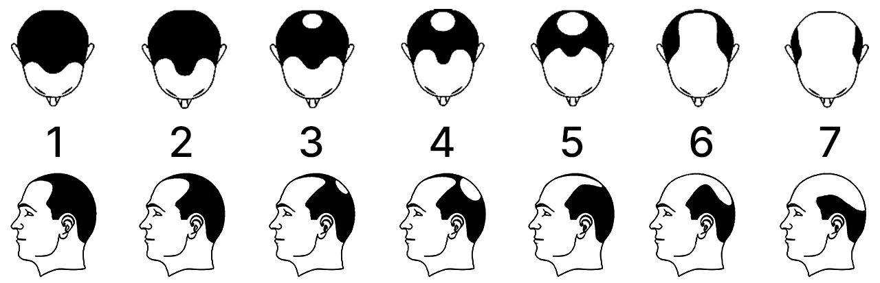 Эта классификация описывает андрогенетическую алопецию — самую частую форму мужского облысения, вызванную действием гормона дигидротестостерона (ДГТ).